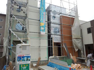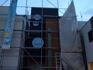 名古屋市瑞穂区新築外壁工事 昨日、思っていたより時間がかかりましたが、丸窓部分の外壁が張り終わりました。 明日、残り玄関部分の壁を張って、丸窓部分をしっかりコーキングしたら工事終了です。