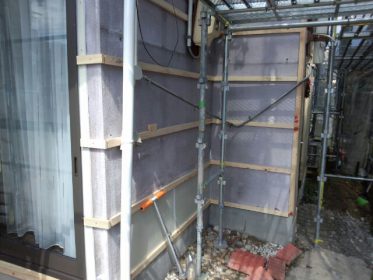 麻布様物件の外壁カバー工事です。 最近、モルタルのカバー工事が増えてきた!ひび割れ等劣化がひどい。やっと下地工事が終わりました。 これからモルタルを下穴無しで打ち抜けるビスか鉄砲でないかな~