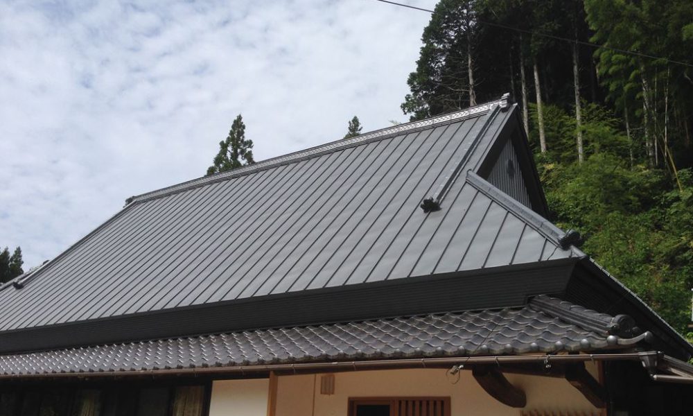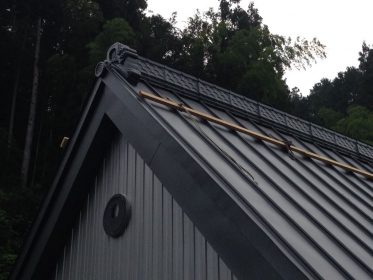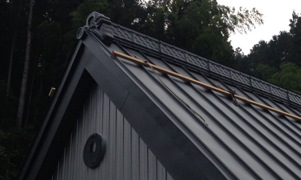 古くなった波板屋根のカバー工法です。釘の見えないたてひら葺きで施工し屋根装飾も新しくしました。